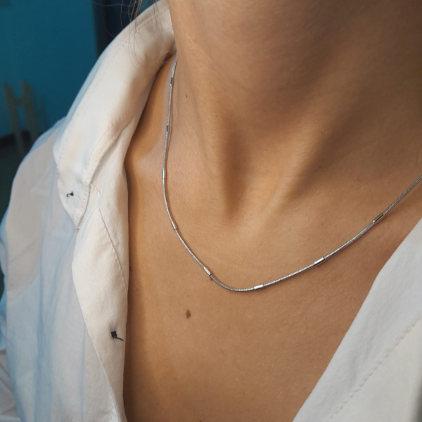 Este collar de acero blanco se distingue por su diseño fino con pequeños detalles que aportan luz en cada movimiento. Una pieza pensada para acompañarte todos los días, elevando lo simple con elegancia.